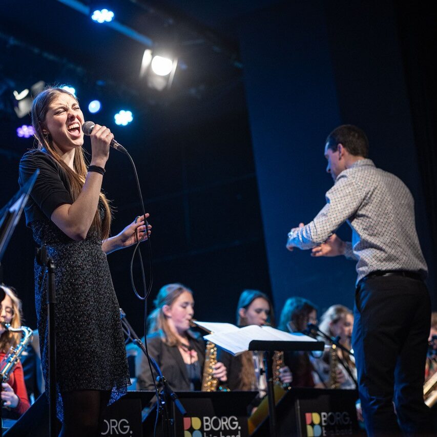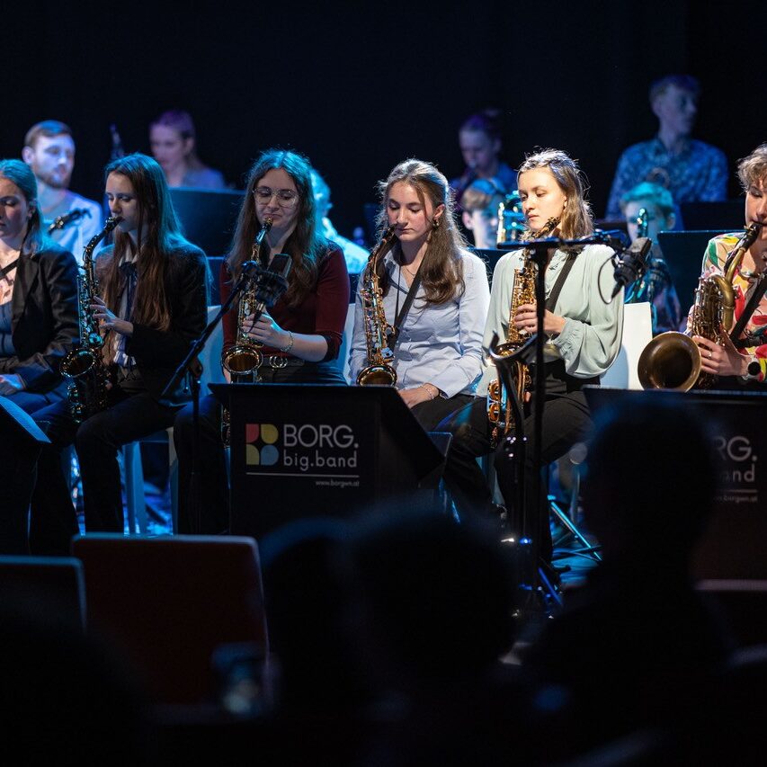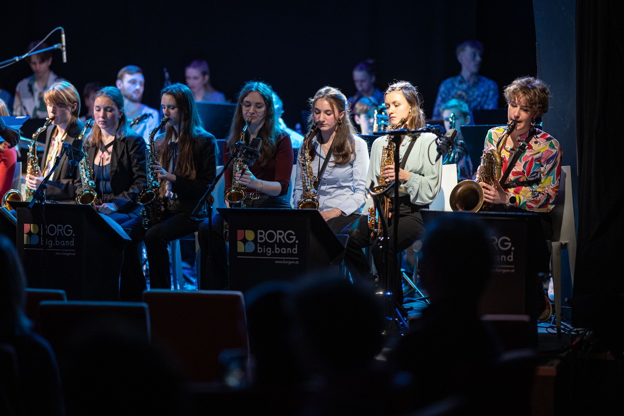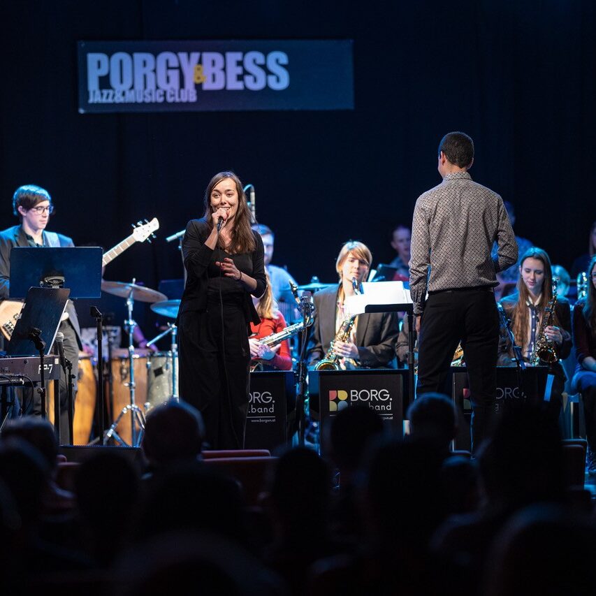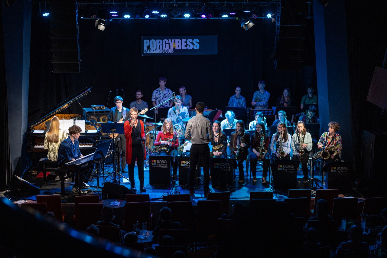 Am Sonntag, dem 08. März 2026 füllte die rund 25-köpfige Schulband unter der Leitung von Prof. Markus Osztovics die Bühne des legendären Wiener Jazzclubs Porgy & Bess. Katharina Osztovics führte am Weltfrauentag durchs dichte Programm. Elena Haidbauer aus der 8M1 eröffnete routiniert mit „Stupid Cupid“ gleich im zweiten Stück das abwechslungsreiche Programm an Solo-Sänger:innen. Im Anschluss coverte Wuk Pavlovic mit „Schreib a Liad“ von Sebastian Holzer einen BORG-Absolventen. Passend zum Anlass – Stichwort: Weltfrauentag – begab sich Amelie Preissinger auf Aretha Franklins Spuren, was ihr außerordentlich gut gelang, bevor es mit „Don´t know why“ – gesungen von Anahit Saribekyan – für einen Moment ruhiger wurde.