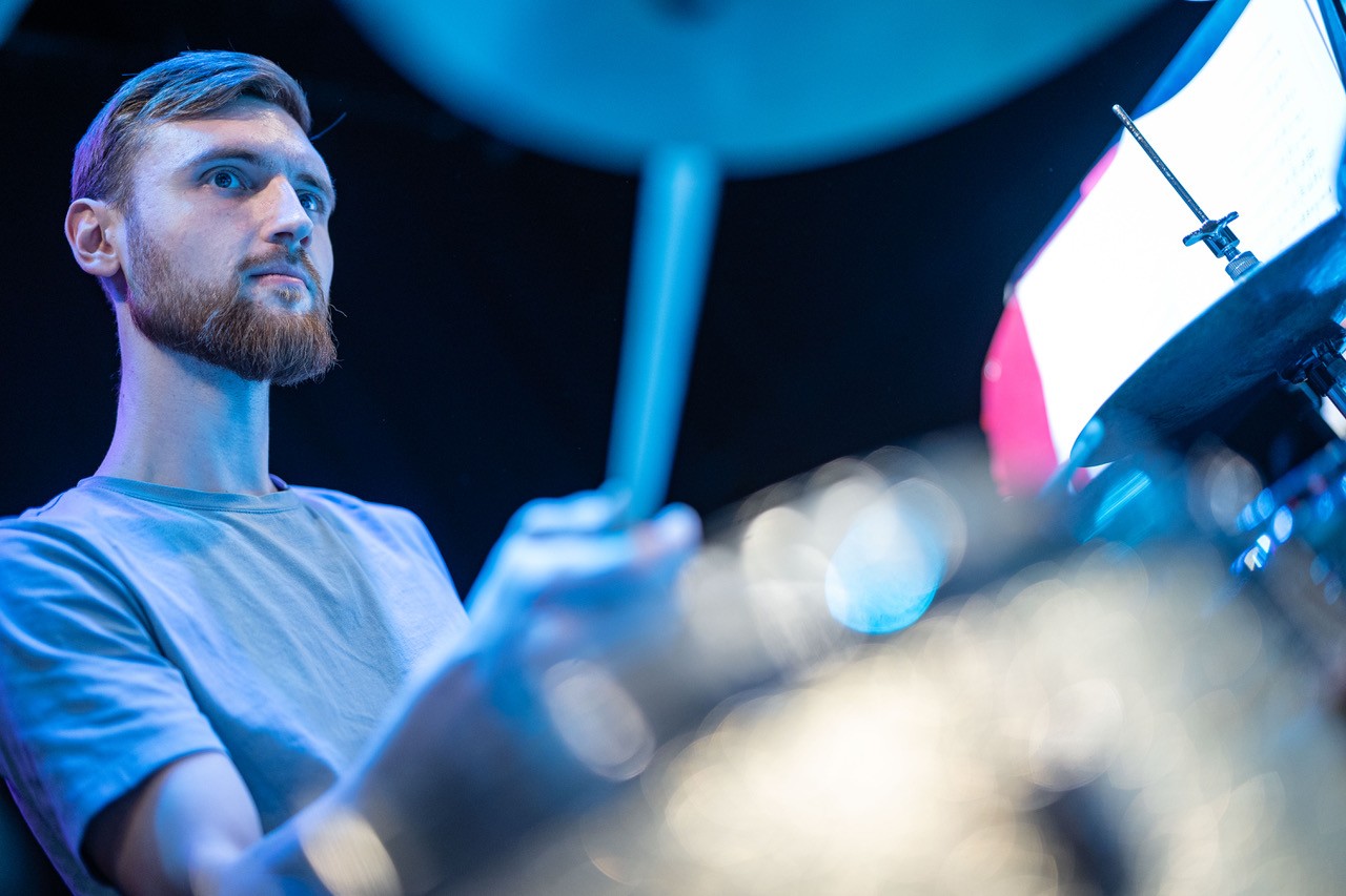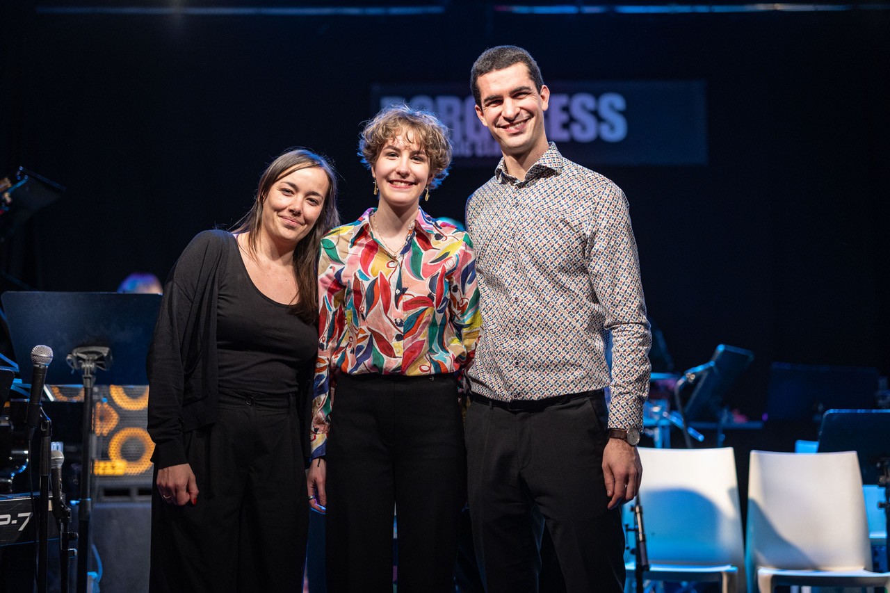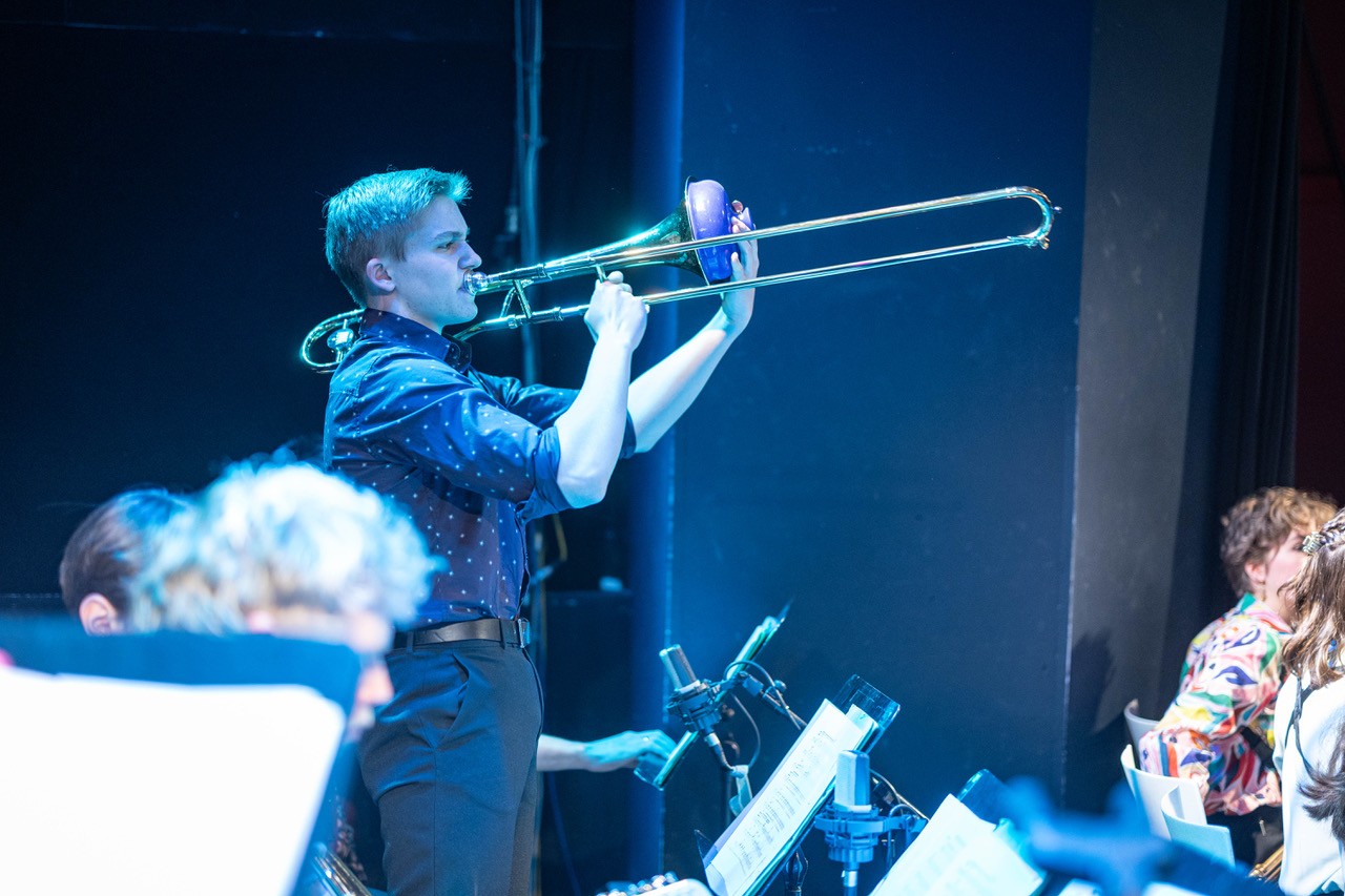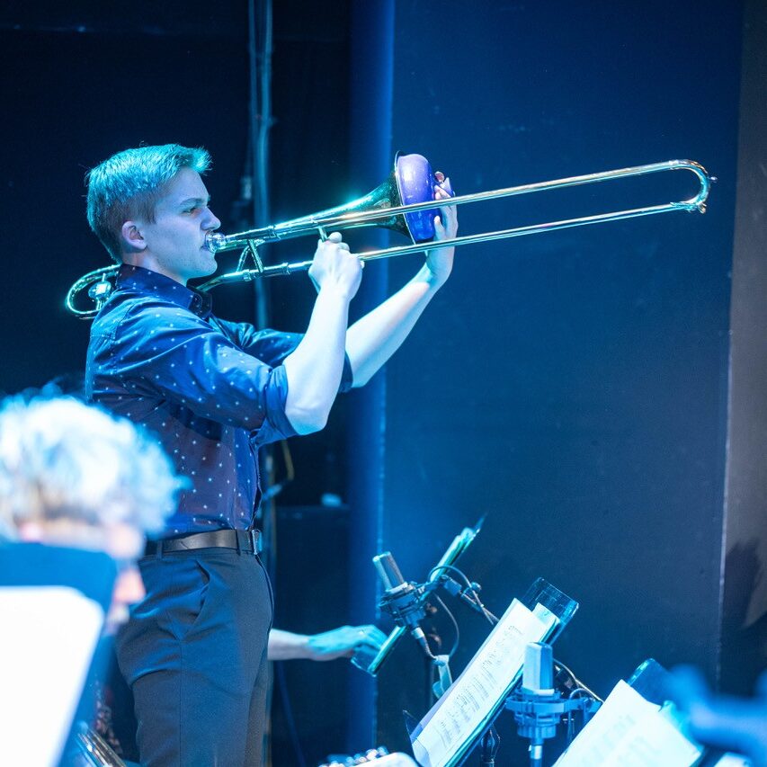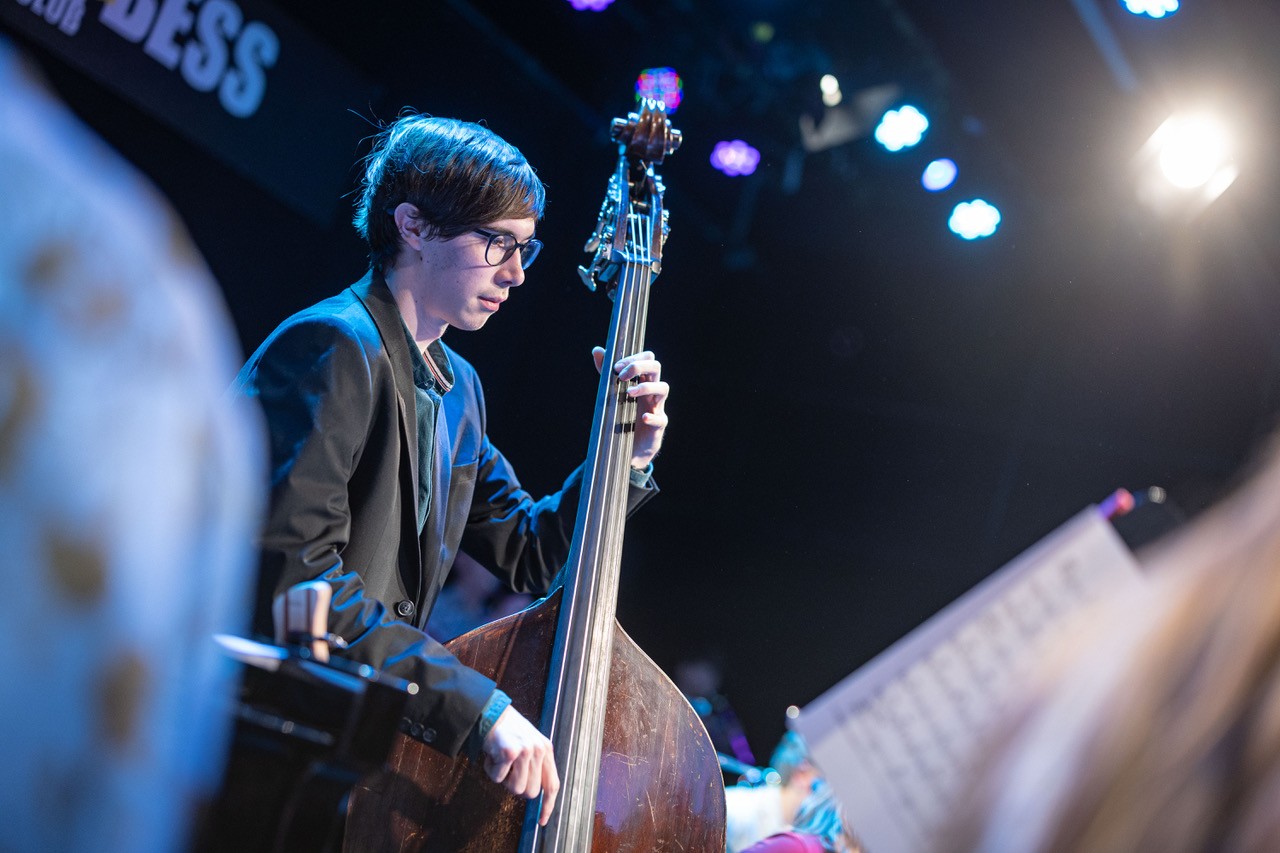 Apropos „Schulband“: Diese Bezeichnung mag zwar stimmen, wird der Professionalität dieser Truppe allerdings bei weitem nicht gerecht. Dem Publikum wurde an diesem Sonntag eine Performance geboten, die dem ehrwürdigen Wiener Jazzclub, bei dem internationale Größen der Musikszene ein und aus gehen, in allen Belangen gerecht wurde. Die vielen perfekt exerzierten Solis offenbarten das musikalische Können unserer Schüler:innen. Ob Emanuel Pachler an der Posaune, Esther Graggaber am Sax, Toni Bertz an der E-Gitarre oder Valentin Narosy am Kontrabass – es waren zu viele, um sie hier alle zu nennen. Wenn der Blick zwischendurch dann einmal zum „Bandleiter“ Prof. Osztovics wandert, wird schnell klar, warum diese Band und ihre individuellen Akteur:innen so gut und harmonisch interagieren: Seine unglaublich authentische und ermutigende Art und seine bedingungslose Positivität übertragen sich auf den gesamten Saal.
