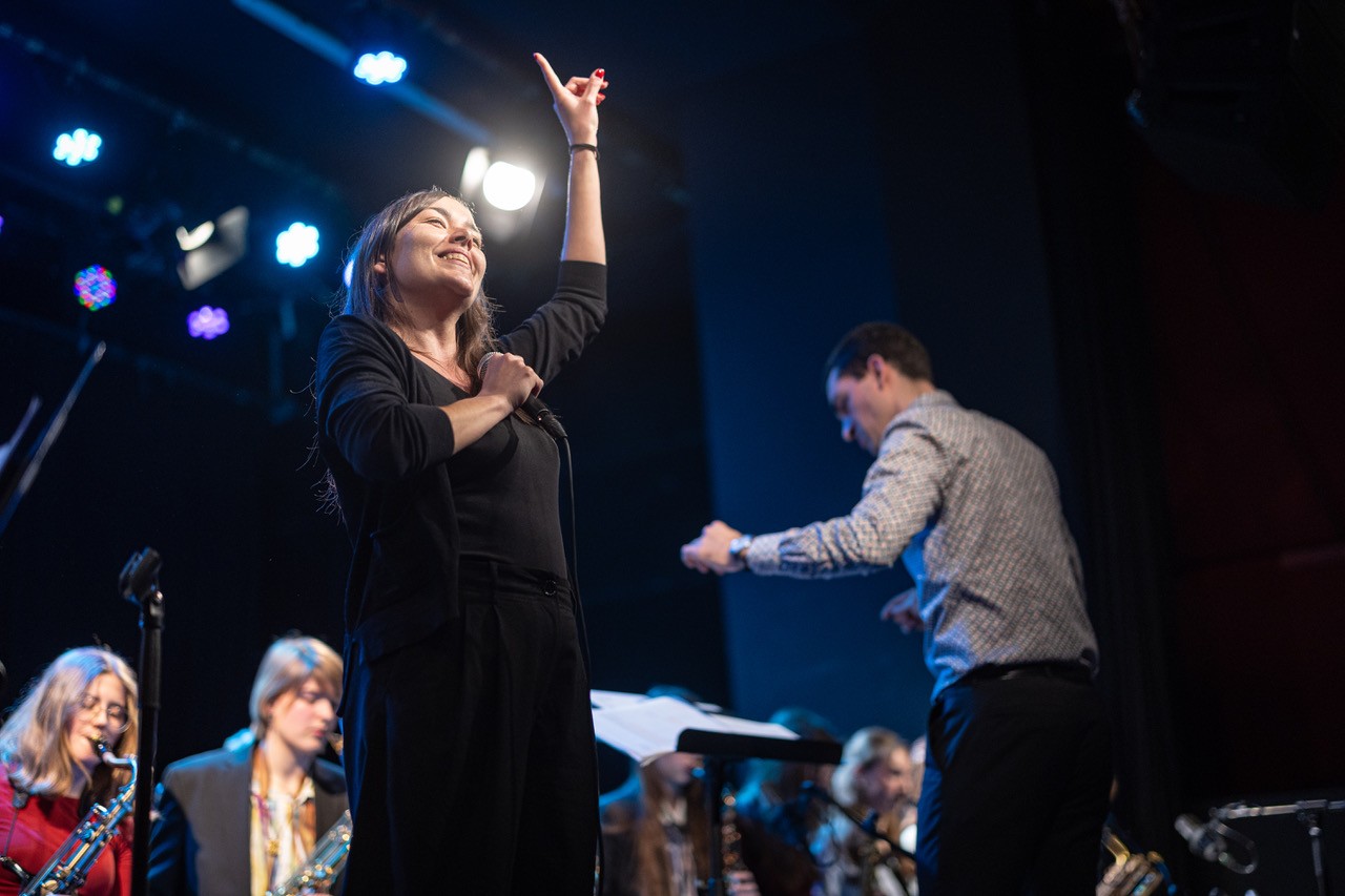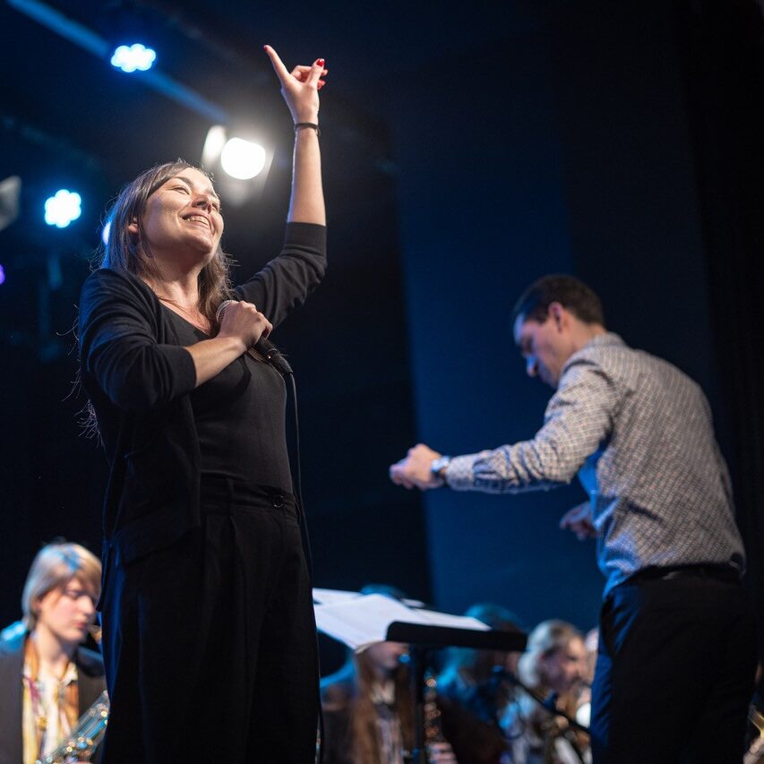 Mein persönliches Highlight war die Uraufführung des Gedichts „Schtzn ohne Grmm“ von Paula Osztovics. Die Gewinnerin des heurigen Redewettbewerbs – in der Bigband mit dem Bariton-Saxophon im Einsatz – trug ihr Gedicht, gepaart mit einer Komposition von Markus Osztovics, erstmals der Öffentlichkeit vor. Im Publikum stand dabei neben mir ausgerechnet eines ihrer Vorbilder: Die Wiener Rapperin und Poetry-Slammerin „Yasmo“, die als Überraschungsstargast den zweiten Teil der Setlist performte. Yasmo, normalerweise mit der „Klangkantine“ ohnehin mit einer überdurchschnittlich großen Band auf Tour, war von der BORG.big.band angetan und hatte offenkundig Spaß an diesem speziellen Gig. Auf der Bühne sagte sie (in Richtung der Band): „Ich spüre eure Freude, eure Liebe und euren Stolz“. Ich denke, damit ist alles gesagt – sie hat damit vollkommen recht.